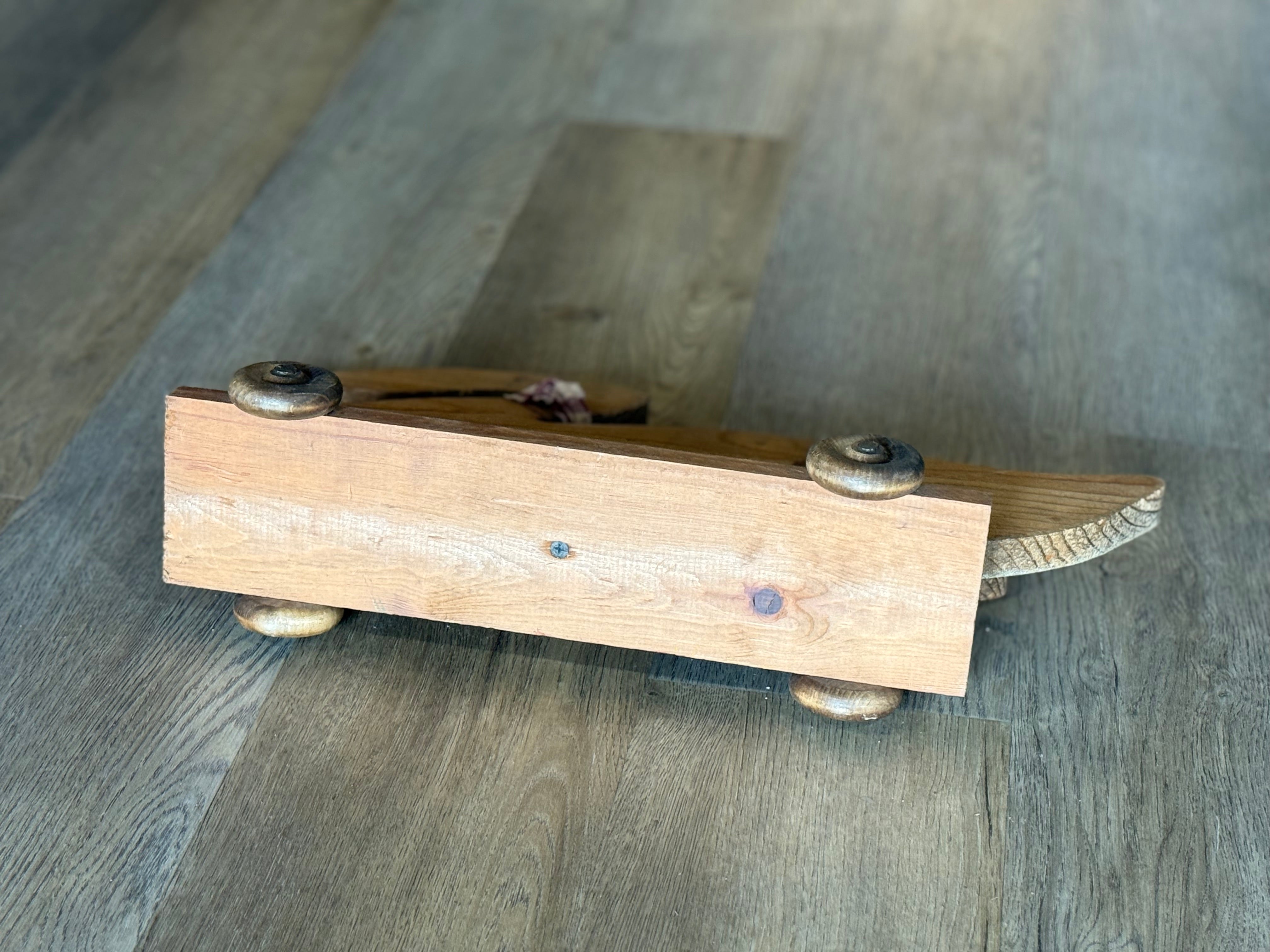 This rustic wooden swan pull toy is the perfect decor for your country cottage or farmhouse. The swan is crafted from wood and has a distressed, weathered white finish. It is mounted on a wooden base with metal wheels, and a plaid ribbon is tied around its neck.