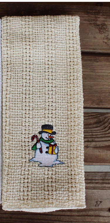 24”x15” 100% Cotton Kitchen Towel with Christmas Embroidery (single towel) The perfect Christmas touch to any country kitchen. Available on an embroidered on a natural towel. Makes a great gift! Made and embroidered in the U.S.A!  Snowman