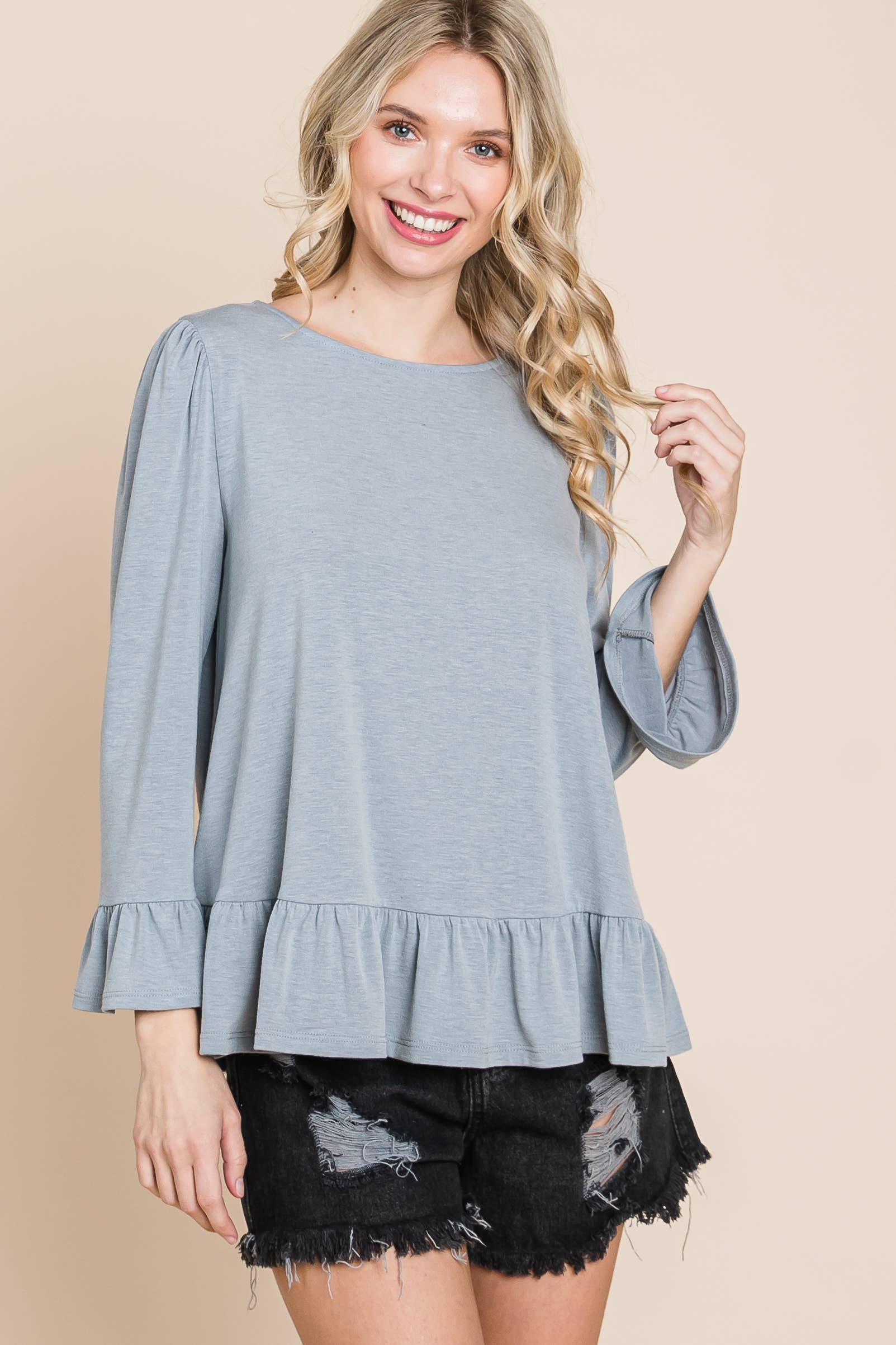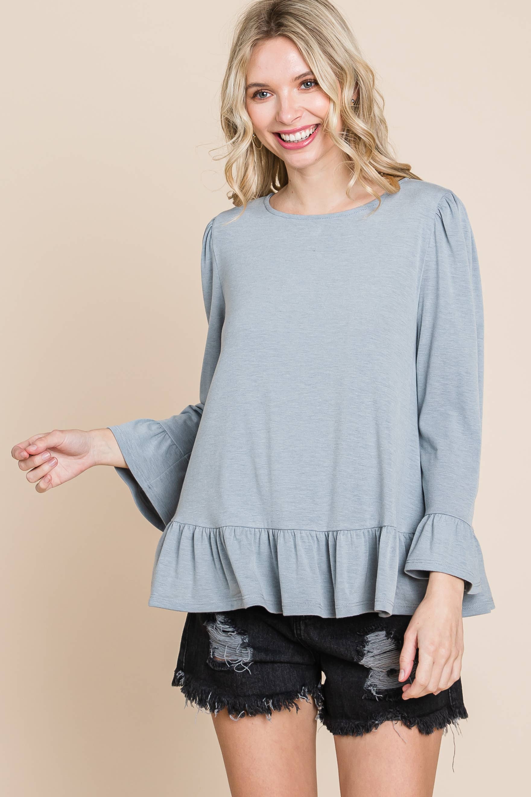 Babydoll Ruffle Hem Solid Top: Grey