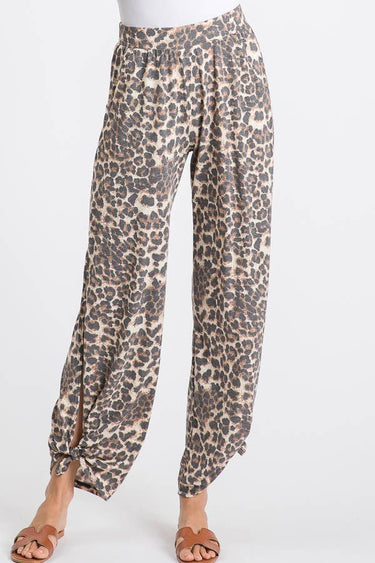 Leopard Print Lightweight Split Side Ankle Tie Pants P3377: Mocha
