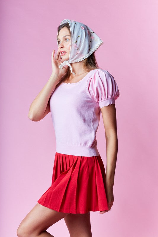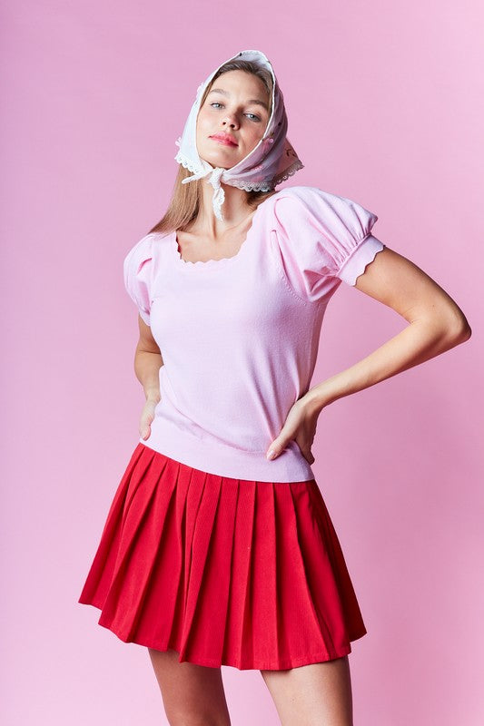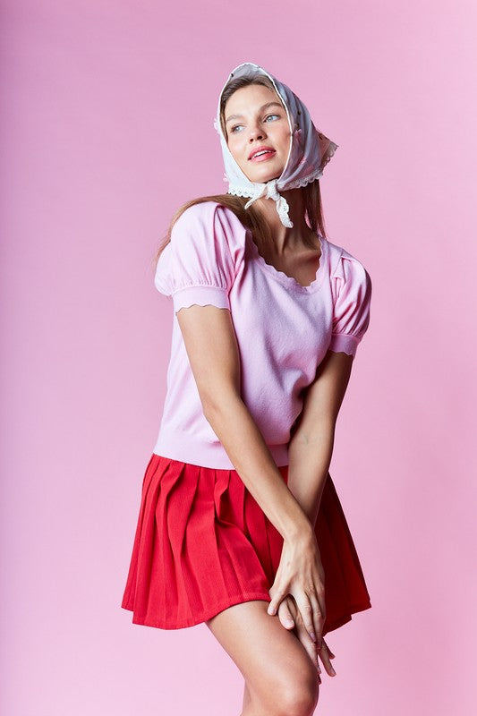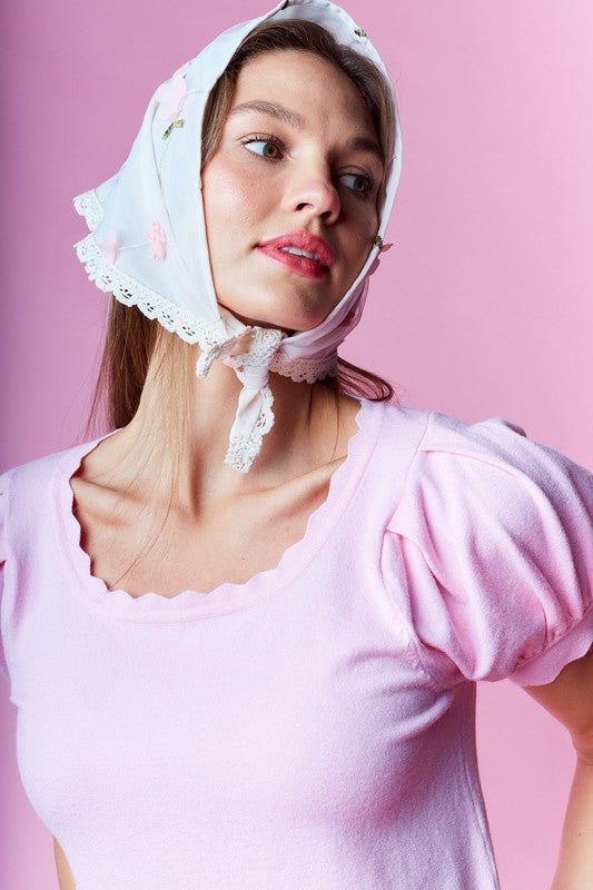 Pink Scallop Edge Puff Sleeve Crop Knit Sweater
