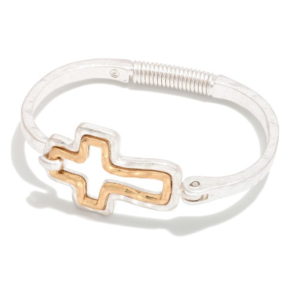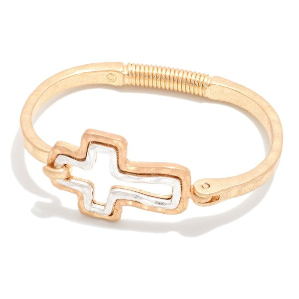 Hammered Metal Hinged Bangle Bracelet Featuring Hollow Cross Accent