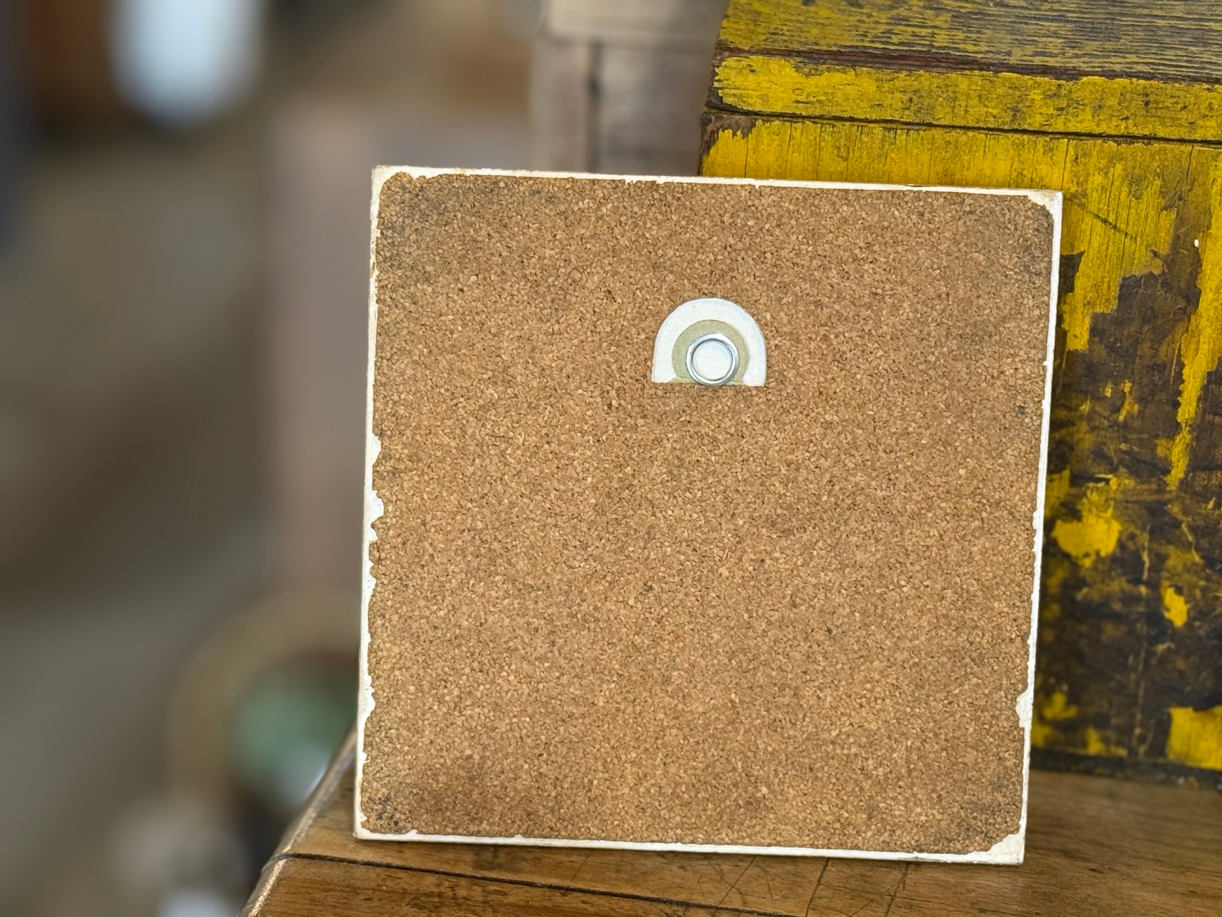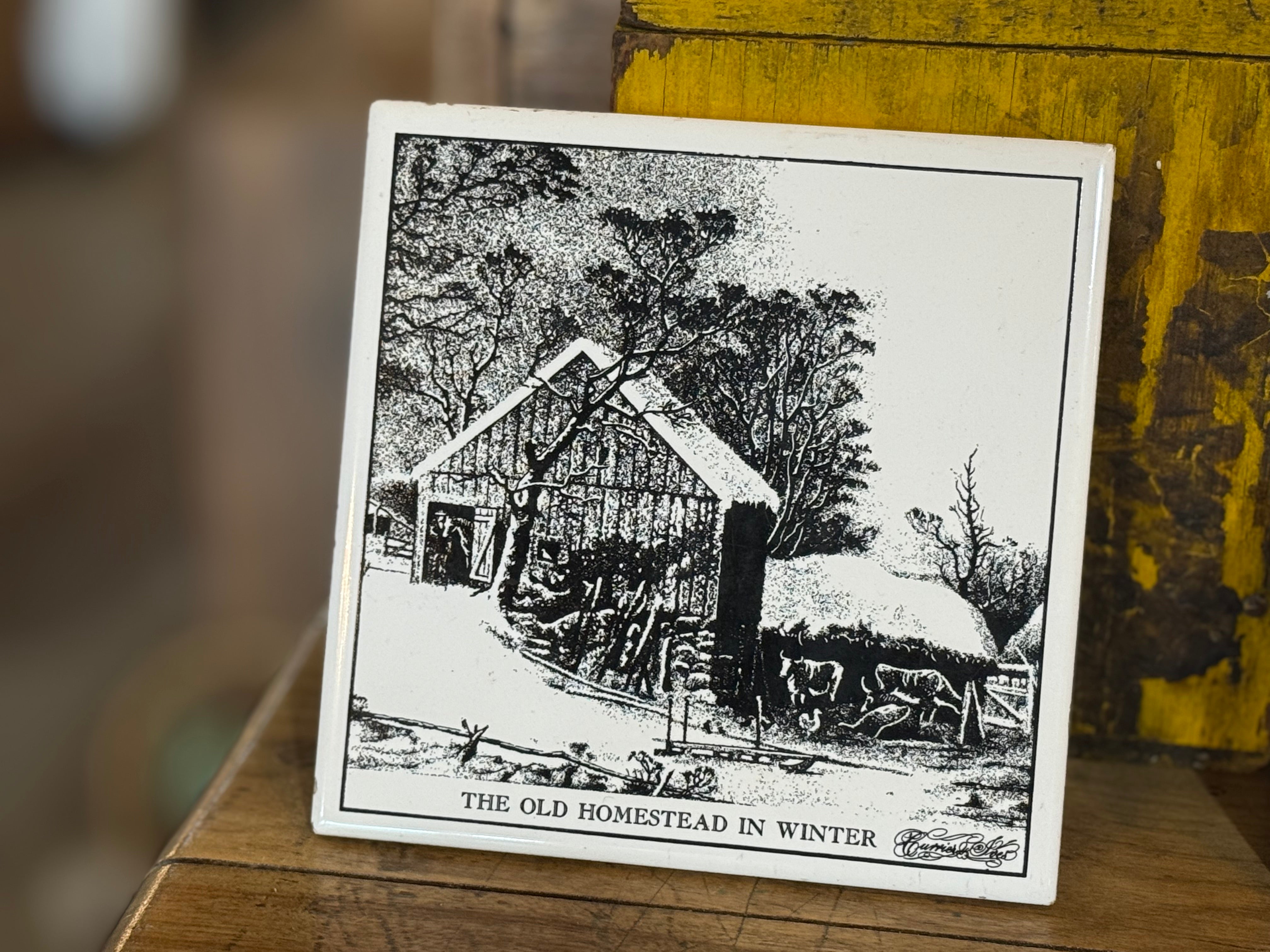 Vintage ceramic tile featuring a black and white illustration titled "The Old Homestead in Winter" by Currier & Ives.