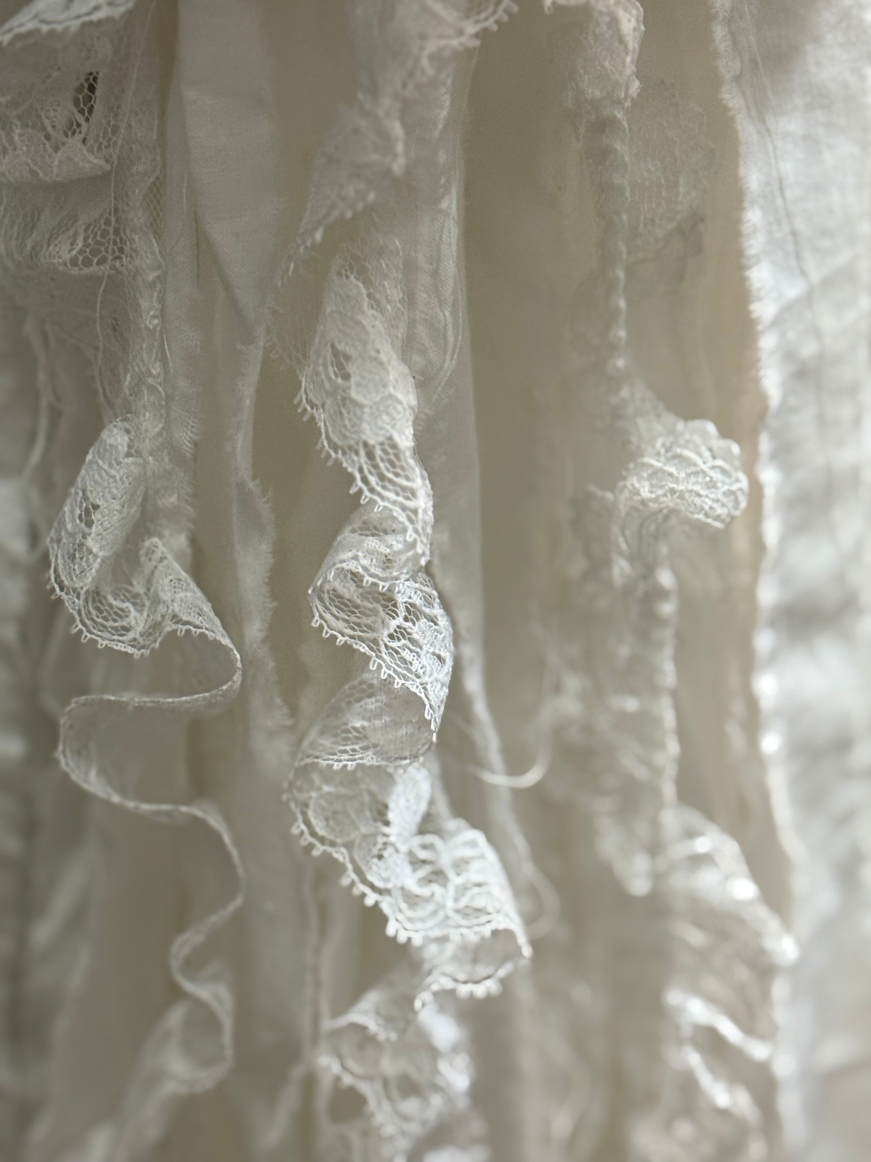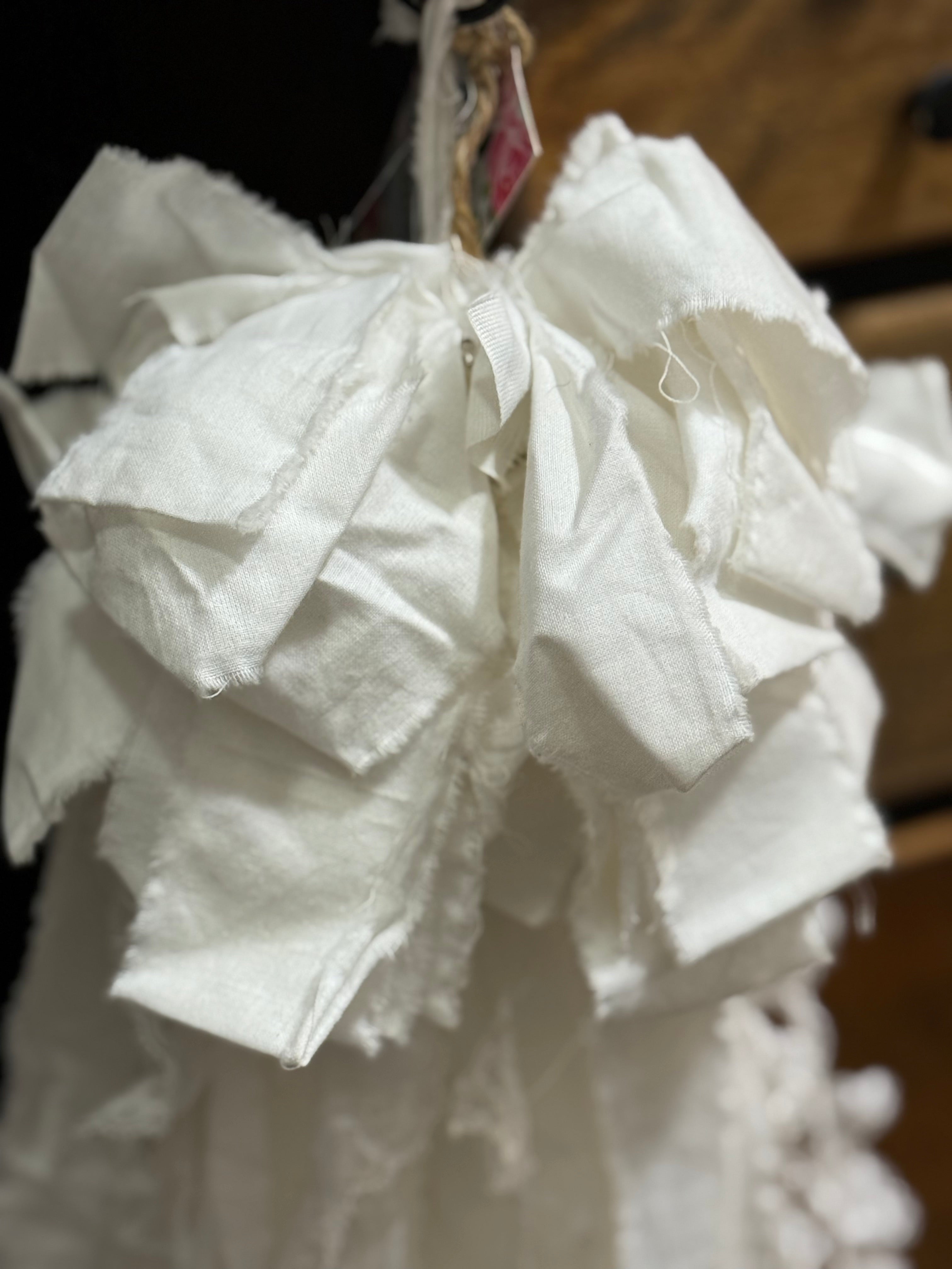 White ragcouture bow: featuring numerous strips of white fabric tied together and arranged to create a voluminous, ruffled effect. The fabric strips have raw & tattered edges, contributing to a shabby-chic or rustic aesthetic.