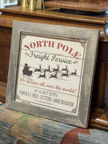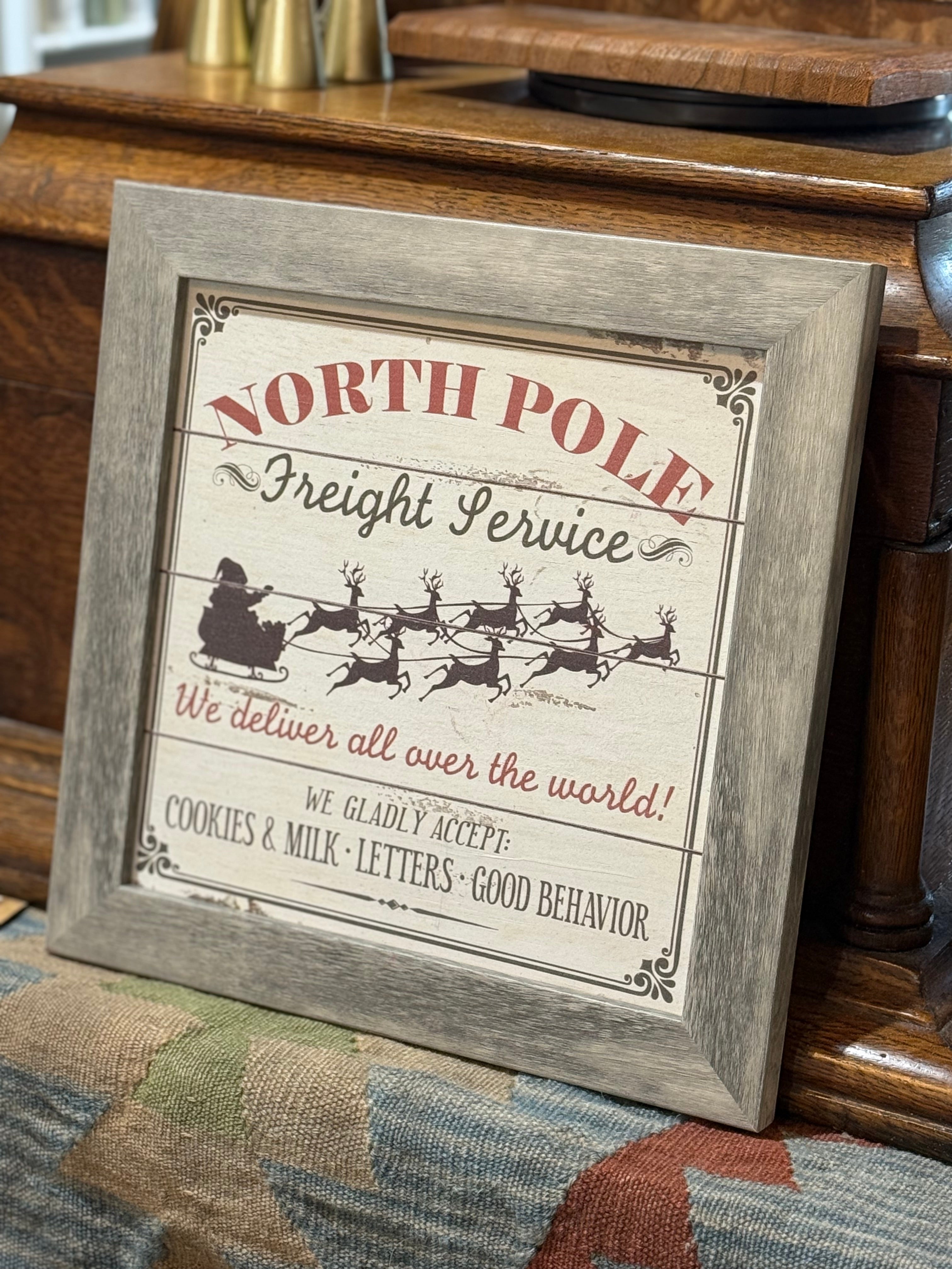 Text reads: "North Pole Freight Service, We deliver all over the world! We gladly accept: Cookies & Milk, Letters, Good Behavior"