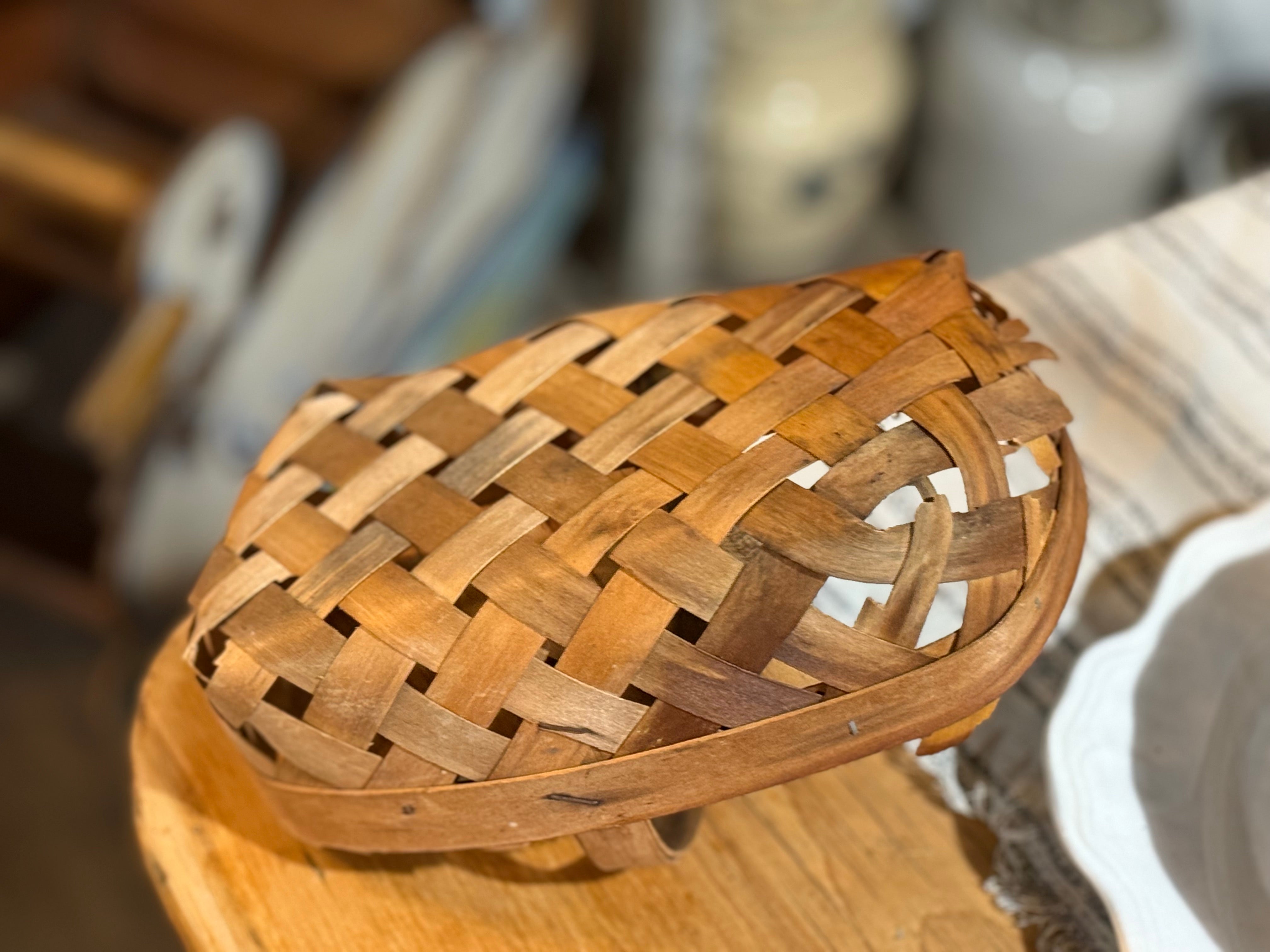 Hand-woven wooden splint basket, once used for gathering fruits, vegetables, or eggs on small family farms. Its rustic charm makes it perfect for farmhouse décor, holding linens, or displaying seasonal finds.