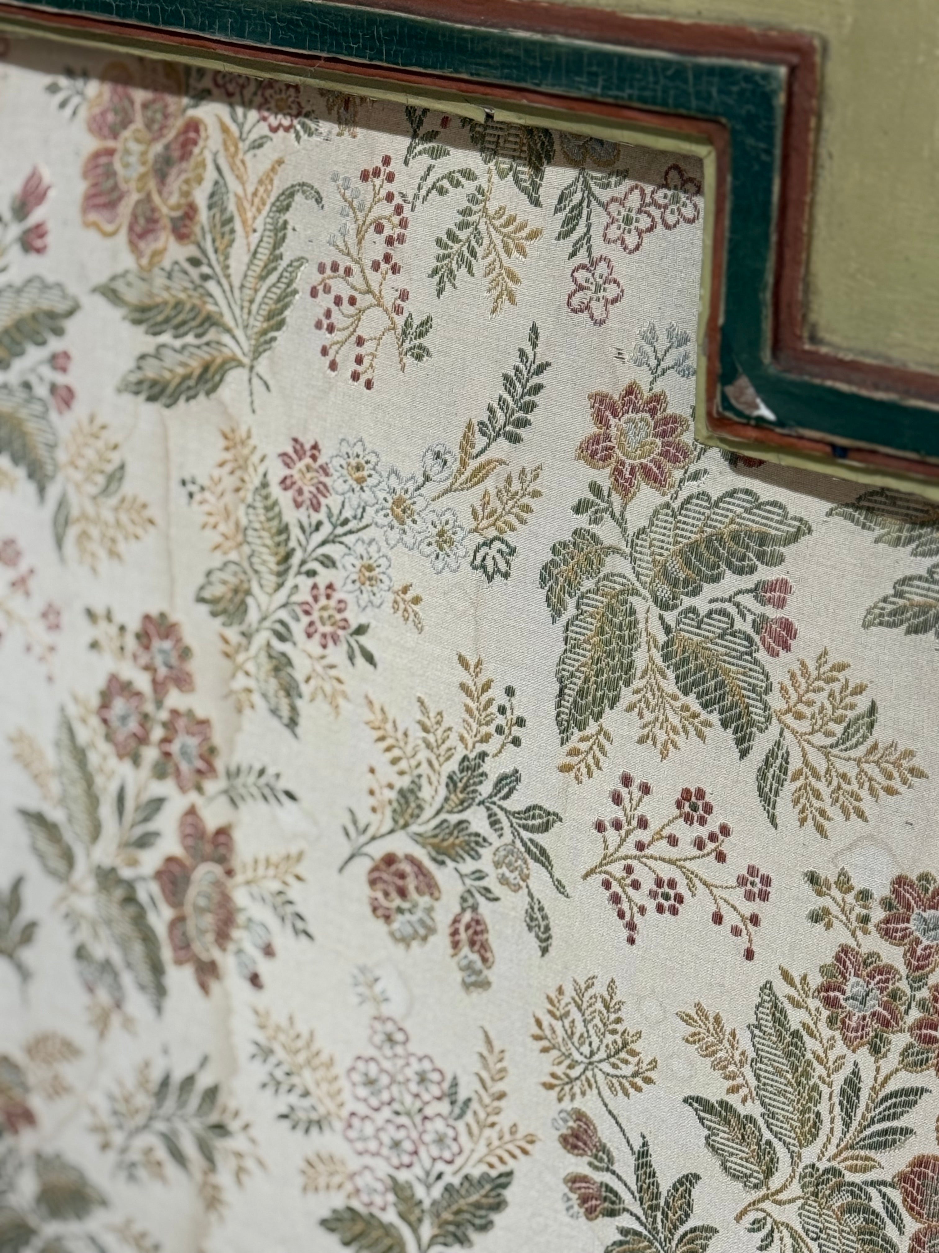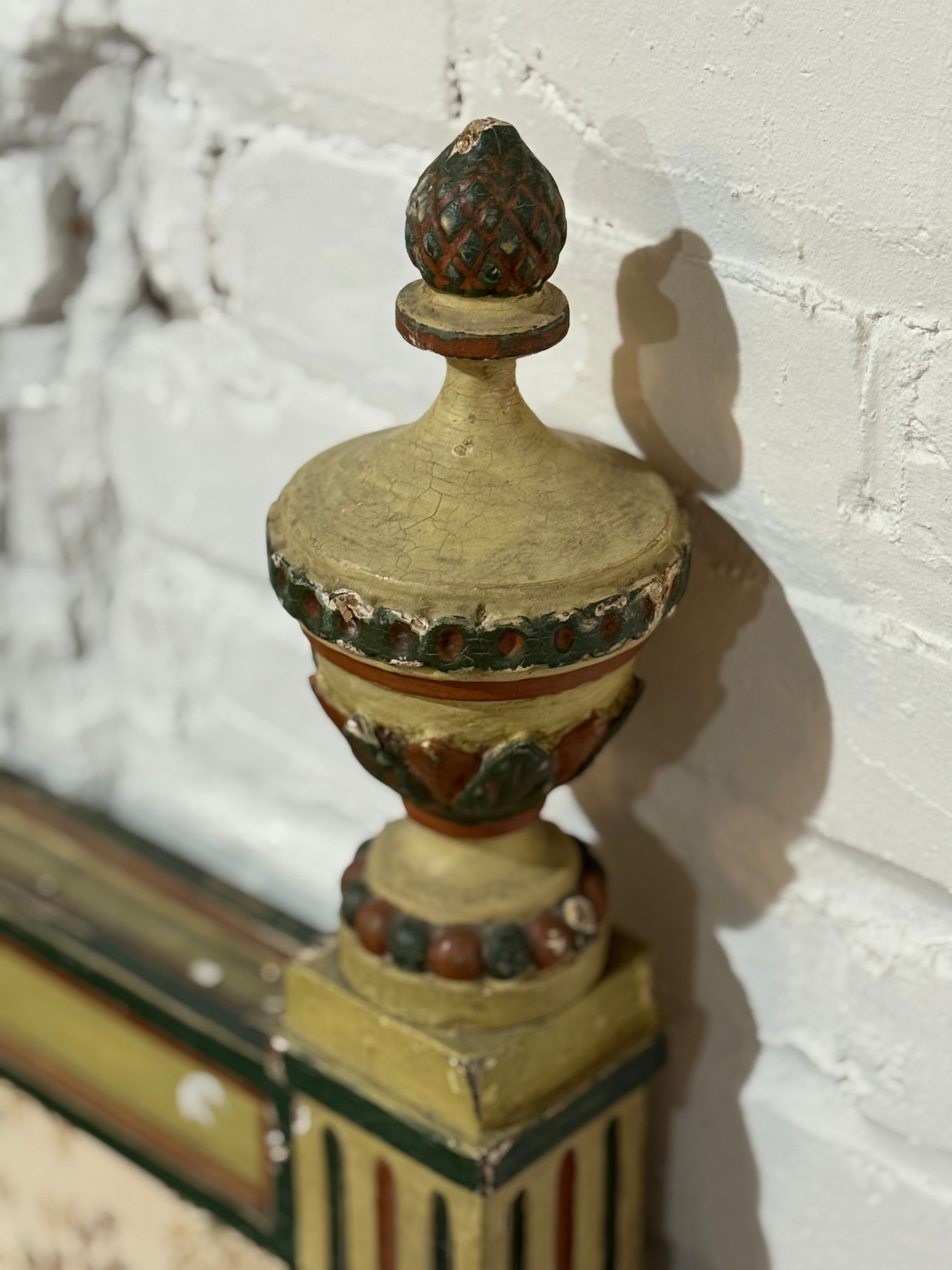 This vintage headboard has a hand-painted frame with a distressed green finish and is upholstered with a floral fabric. The style could be French Provincial, Rococo, or Louis XVI. Hand-carved details and decorative finials!