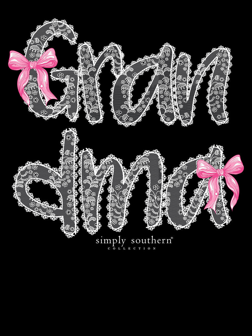 Black long sleeve shirt with the word 'Grandma' detailed in lace and pink bows. Also on left chest. Pink bows along right sleeve. Simply Southern logo below. 100% cotton. Unisex sizing.