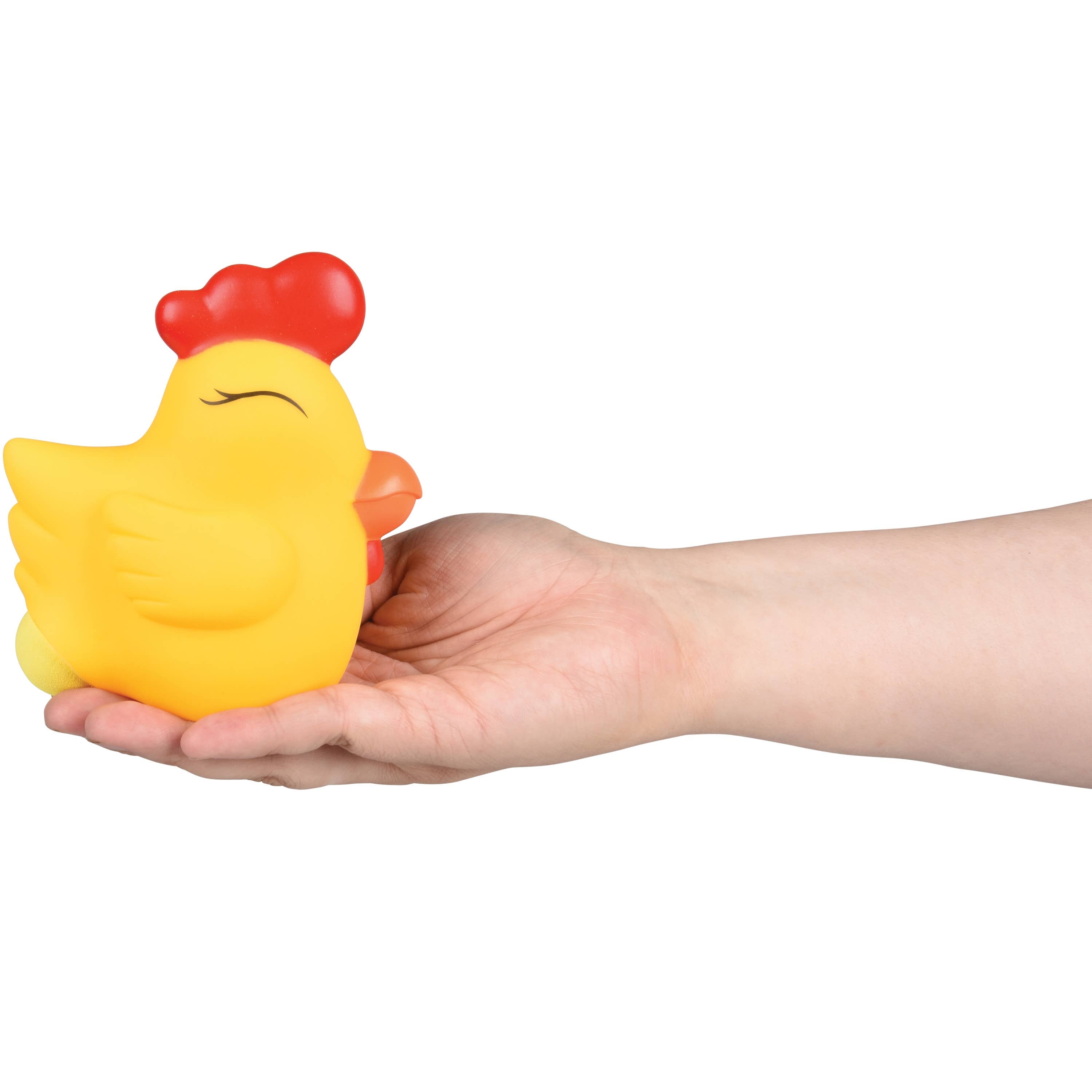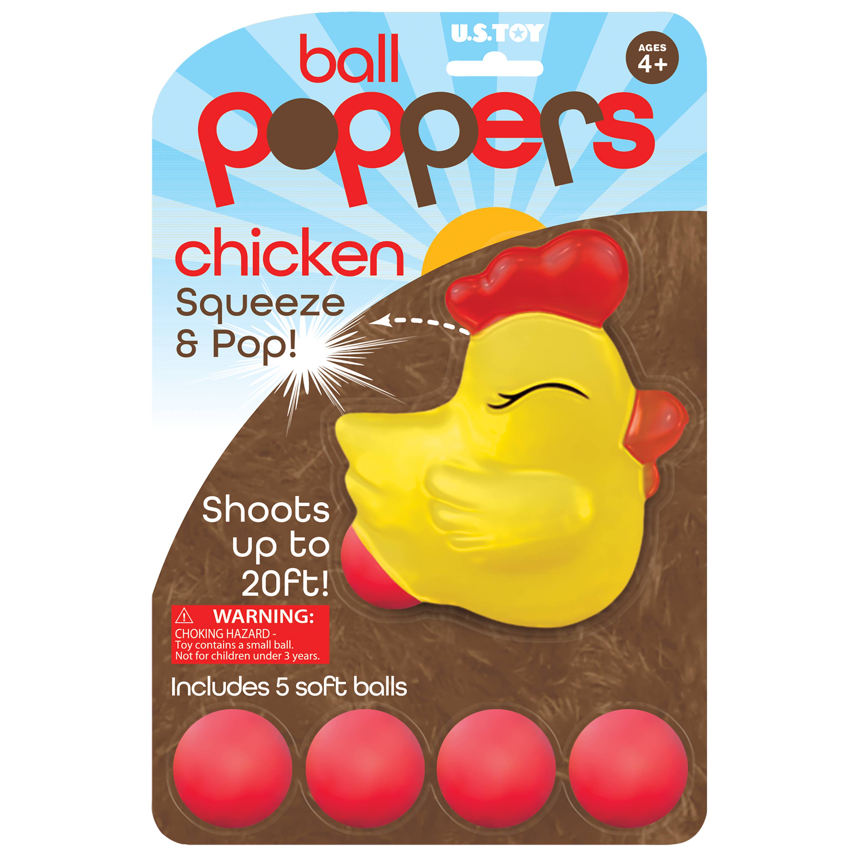 Squeeze the Chicken Popper to shoot a soft foam ball up to 20 feet! Just load them into the popper and squeeze! · Includes 5 foam balls · Made of plastic and foam · Item 6” T. · Blister card package · Age 3+