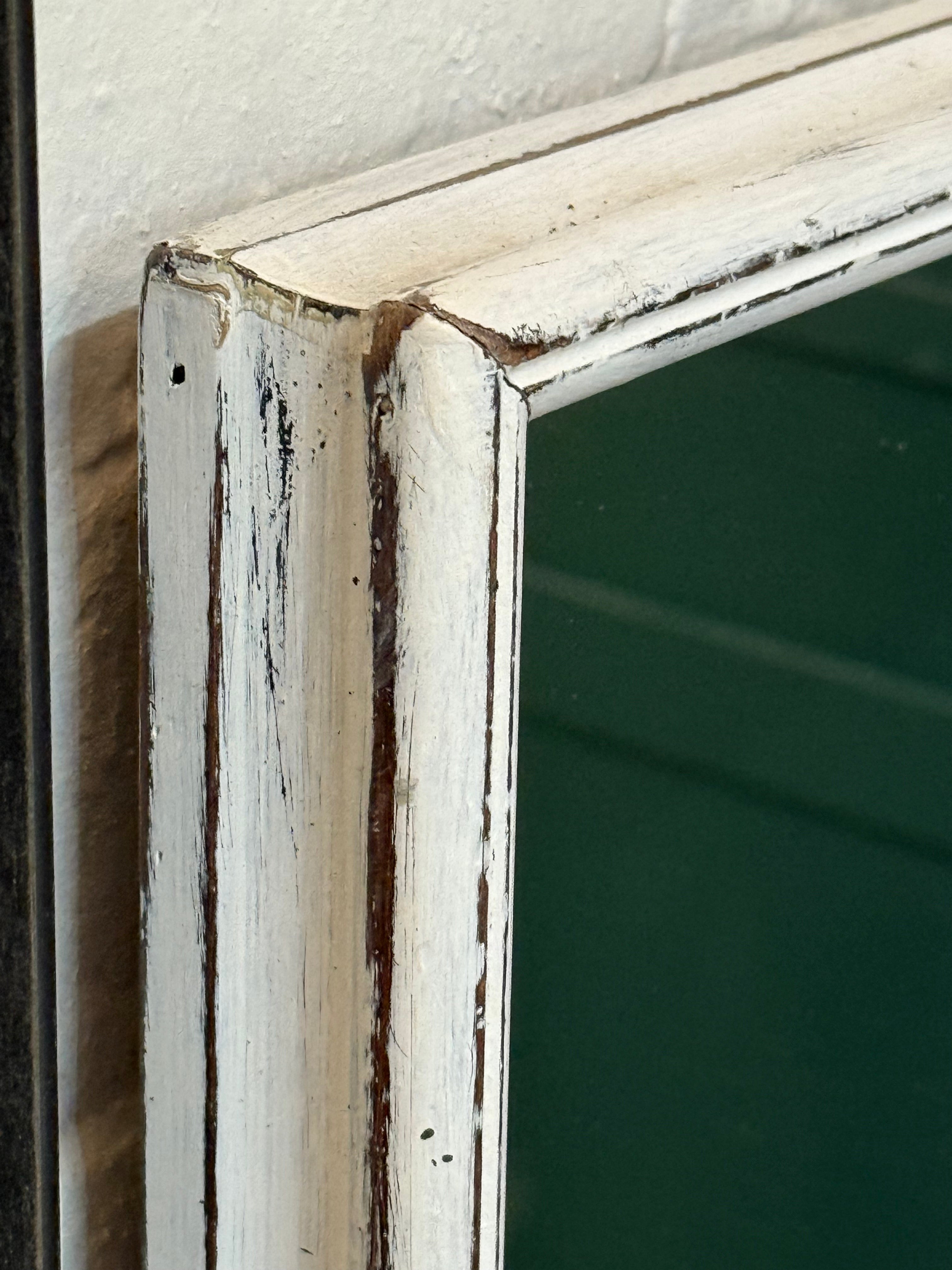 Distressed White Rectangular Mirror. It has been reinforced on the back and hangs safely & easily on the wall. 16" x 22" x 1.5"