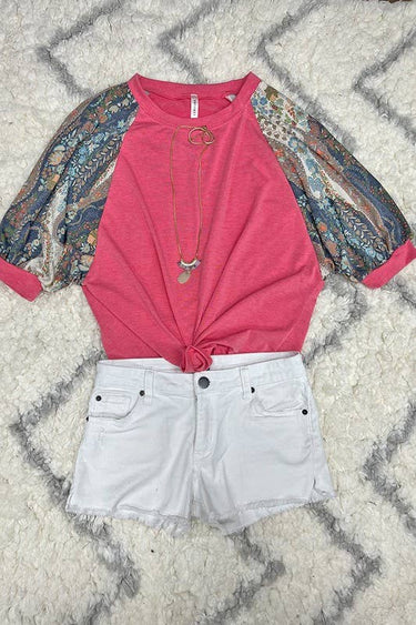 Solid Fashion Top with Floral Dolman Puff Sleeves and Hi-Low Hem 62% Polyester 34% Rayon 4% Spandex
