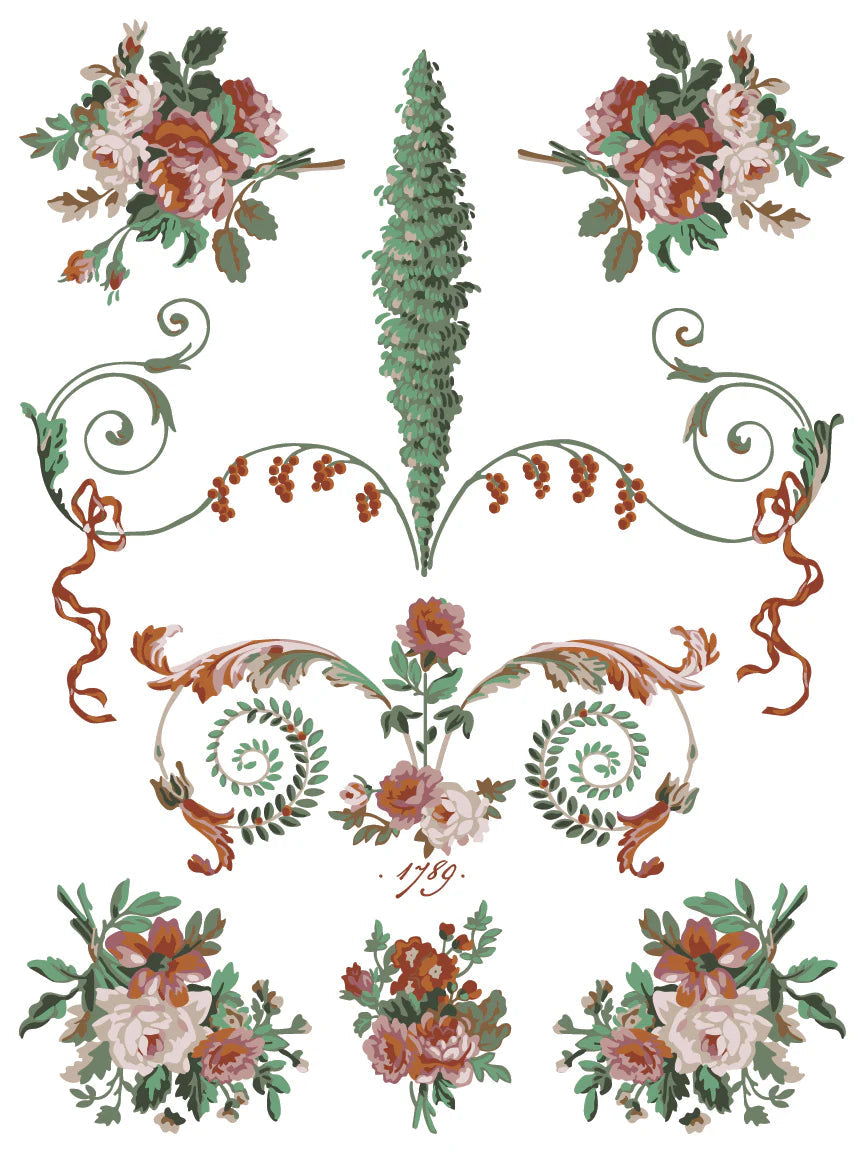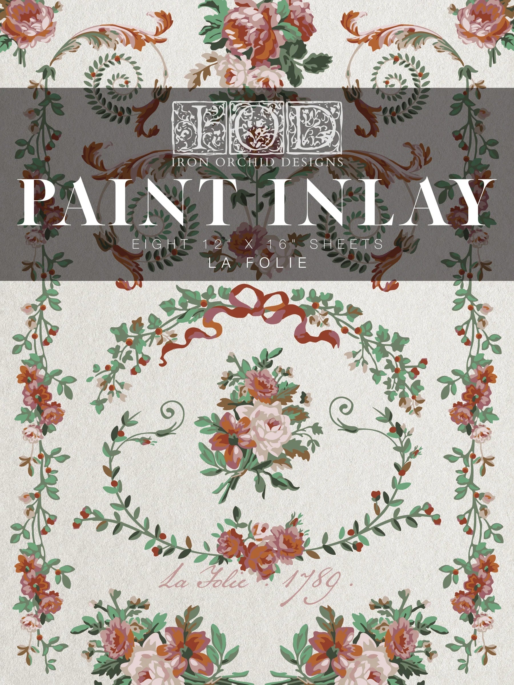 Use La Folie to create romantic small decor sets with floral borders and botanical swags, or pair it with creamy ivory chalk paint on a tray or IOD Wood Arch for an elegant French relief. Embellish a chippy vintage bench or chest for a timeless piece that introduces French countryside charm to your home all season long.
