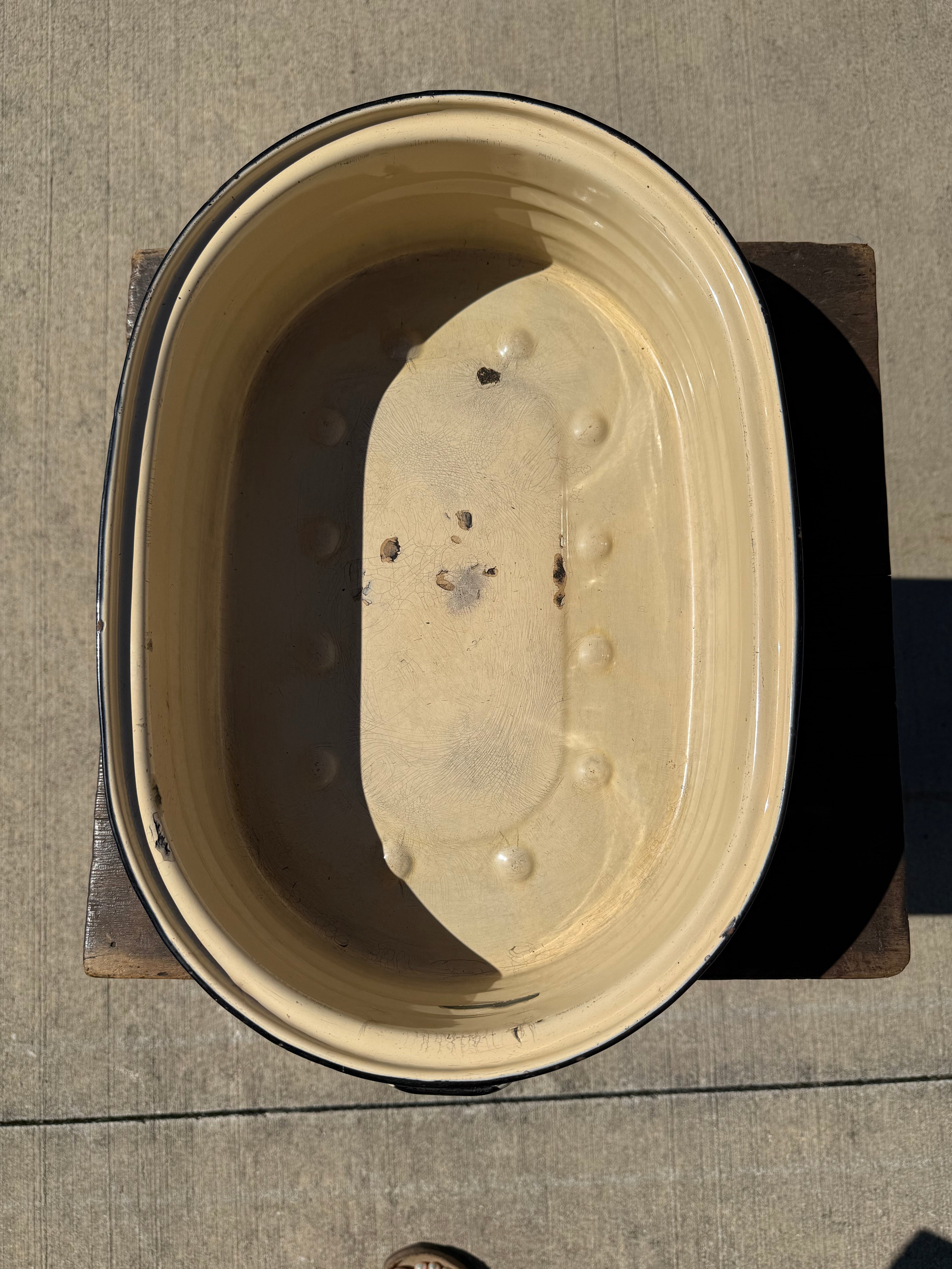 This is a 3 piece vintage enamelware roaster, often referred to as a roasting pan or pot, manufactured by the LISK company. Lisk was a well-known manufacturer of enamelware, which was a popular type of kitchenware from the late 19th through the mid-20th centuries.