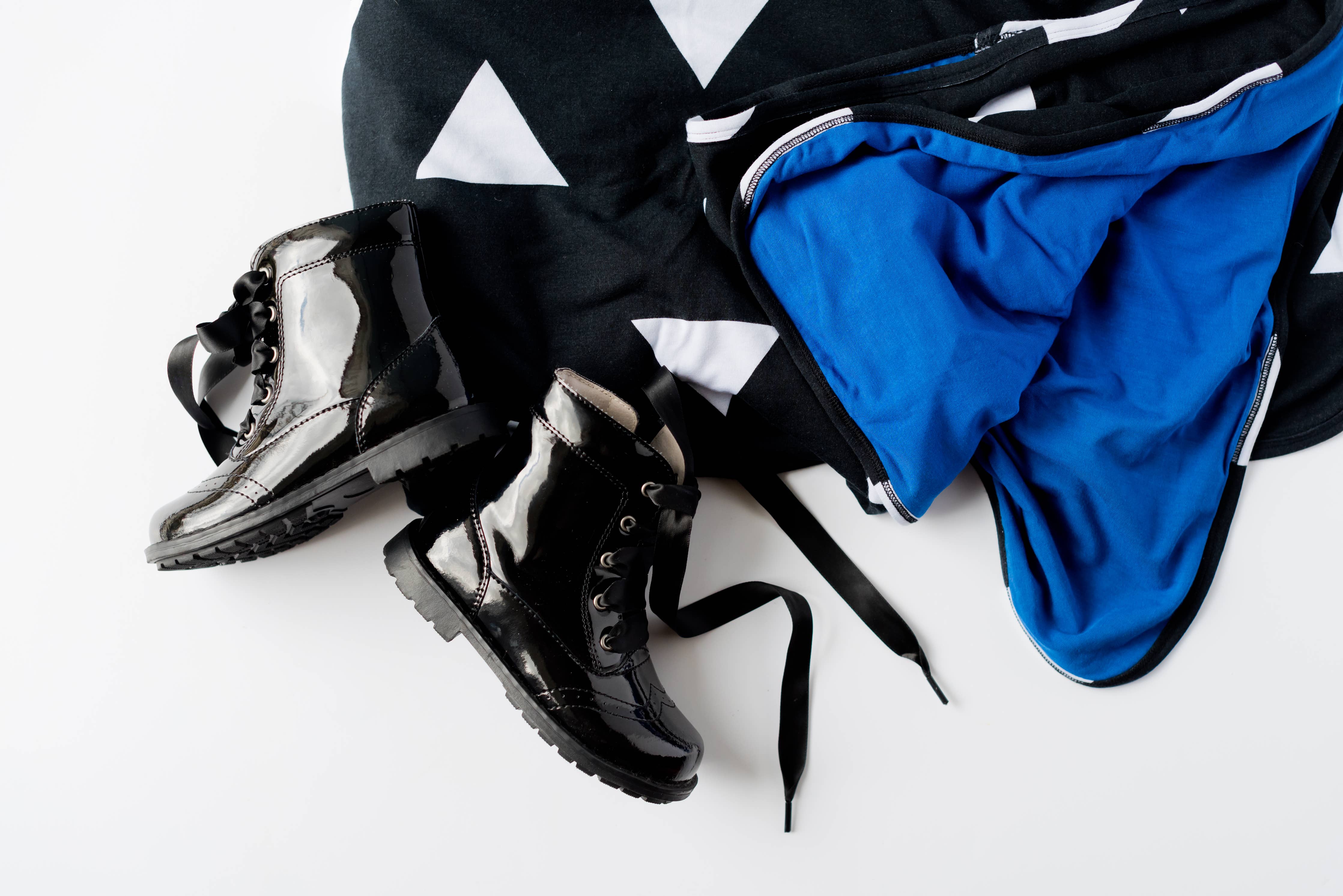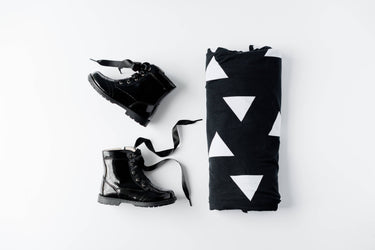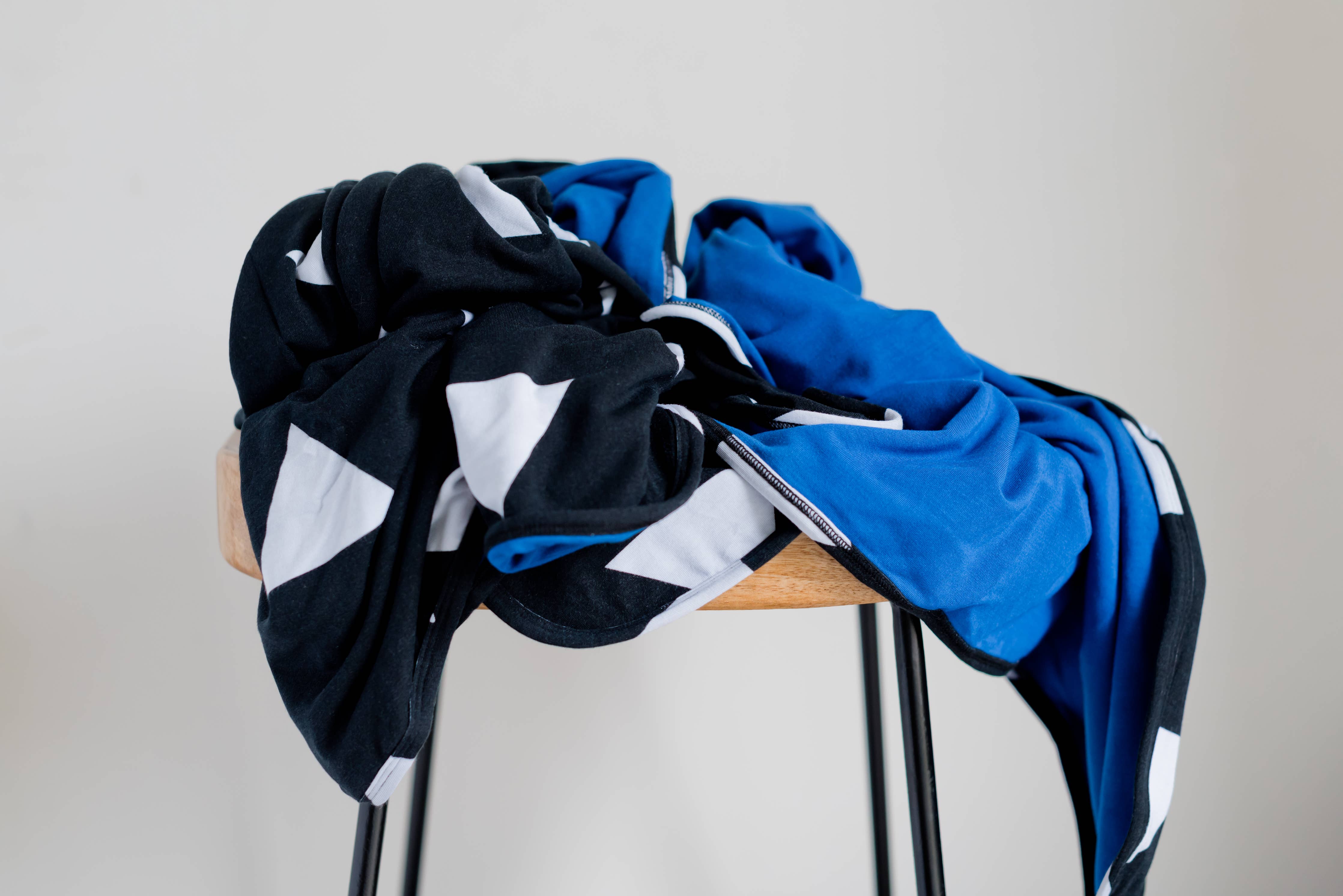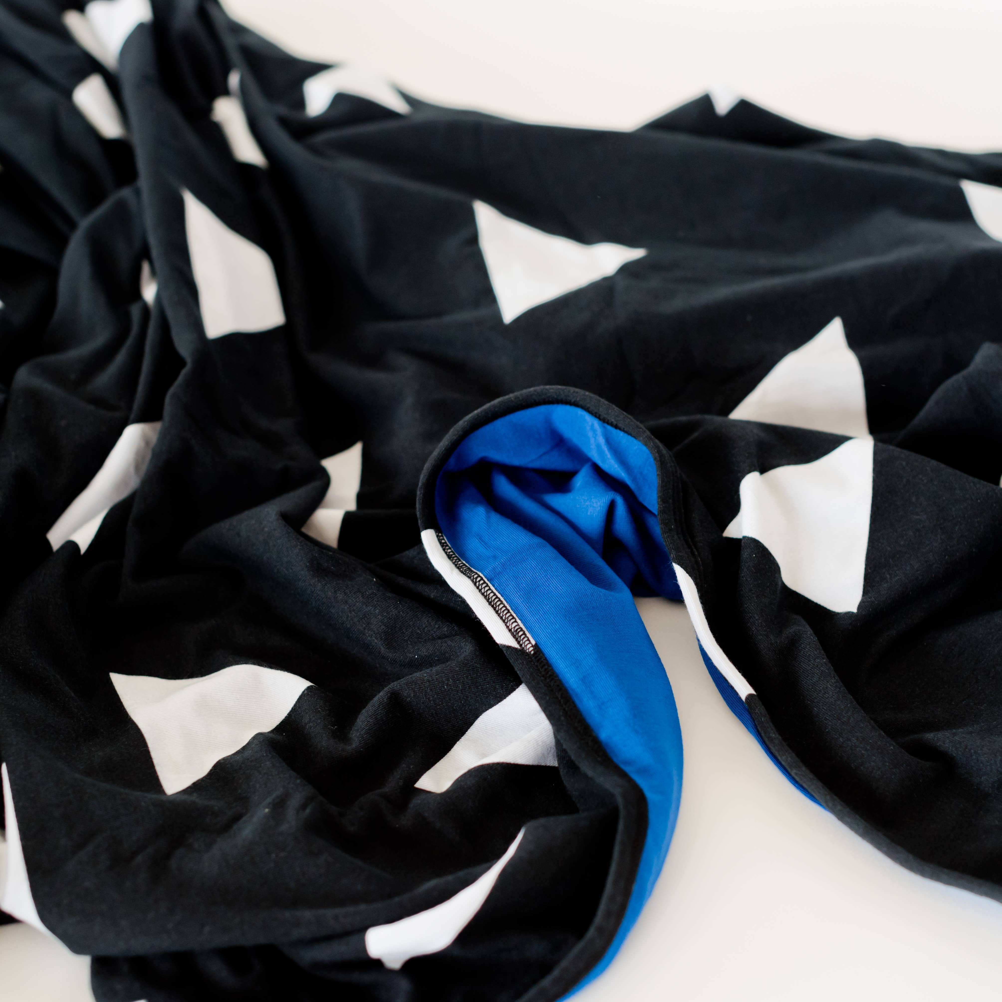 white triangles on a black background, bound seam, backed in royal blue
