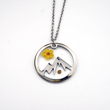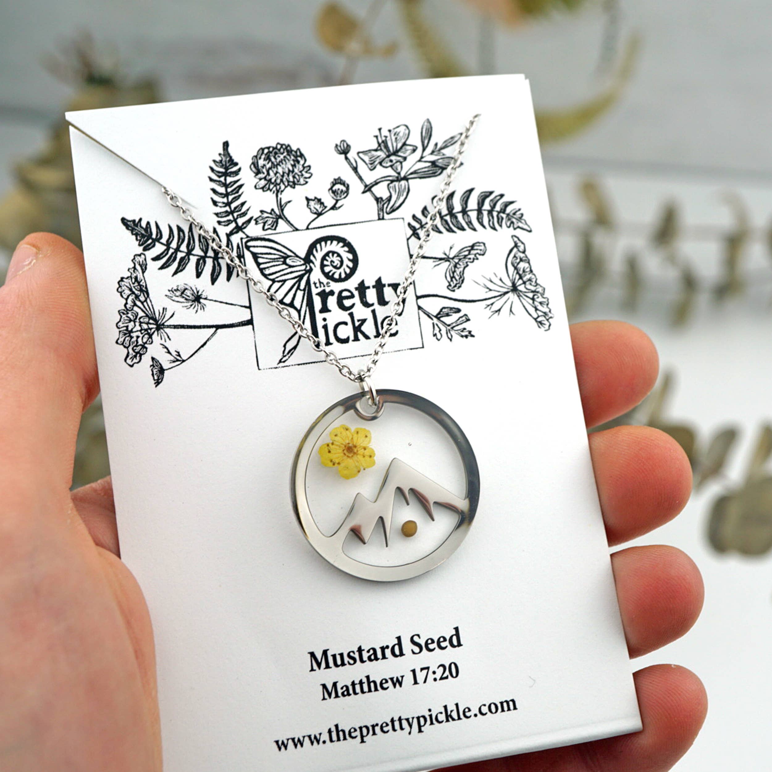 Mountain and Mustard Seed Necklace This awesome mountain range pendant features a real mustard seed and yellow pressed flower, encased in jewelry grade resin. The mustard seed often represents faith- if you have the smallest amount you can move mountains! Measures 1" in diameter and hangs on a 24" stainless steel chain.