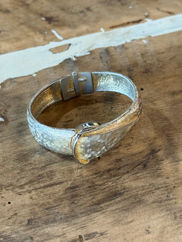 The watch face is concealed by a hinged gold-toned bracelet, giving it the appearance of a bangle when closed. The face is visible when the top part of the bracelet is lifted.
