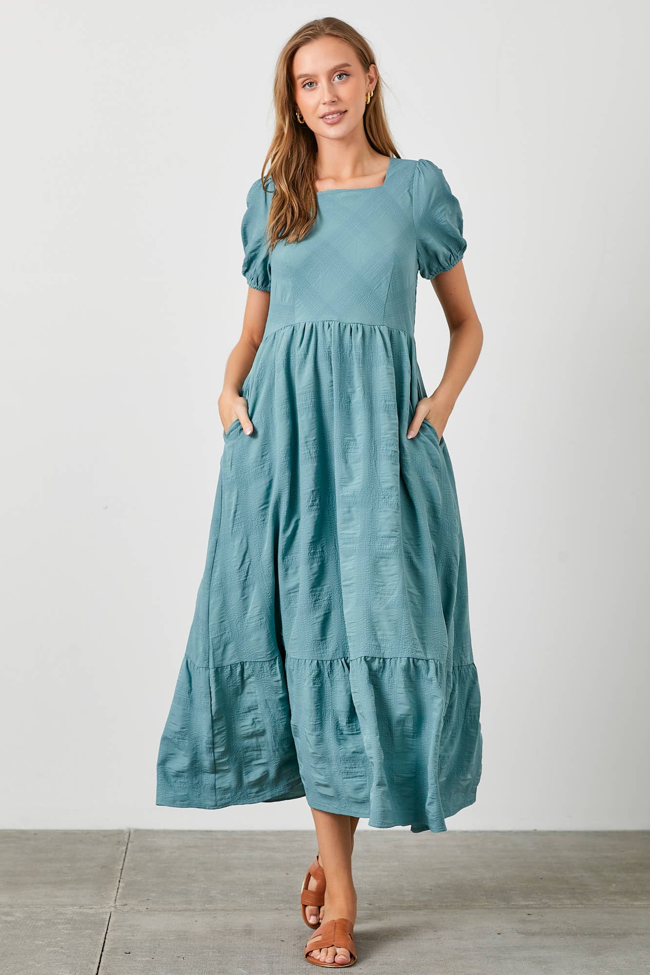 TEXTURED WOVEN SQUARE NECK MIDI DRESS: DUSTY TEAL / L