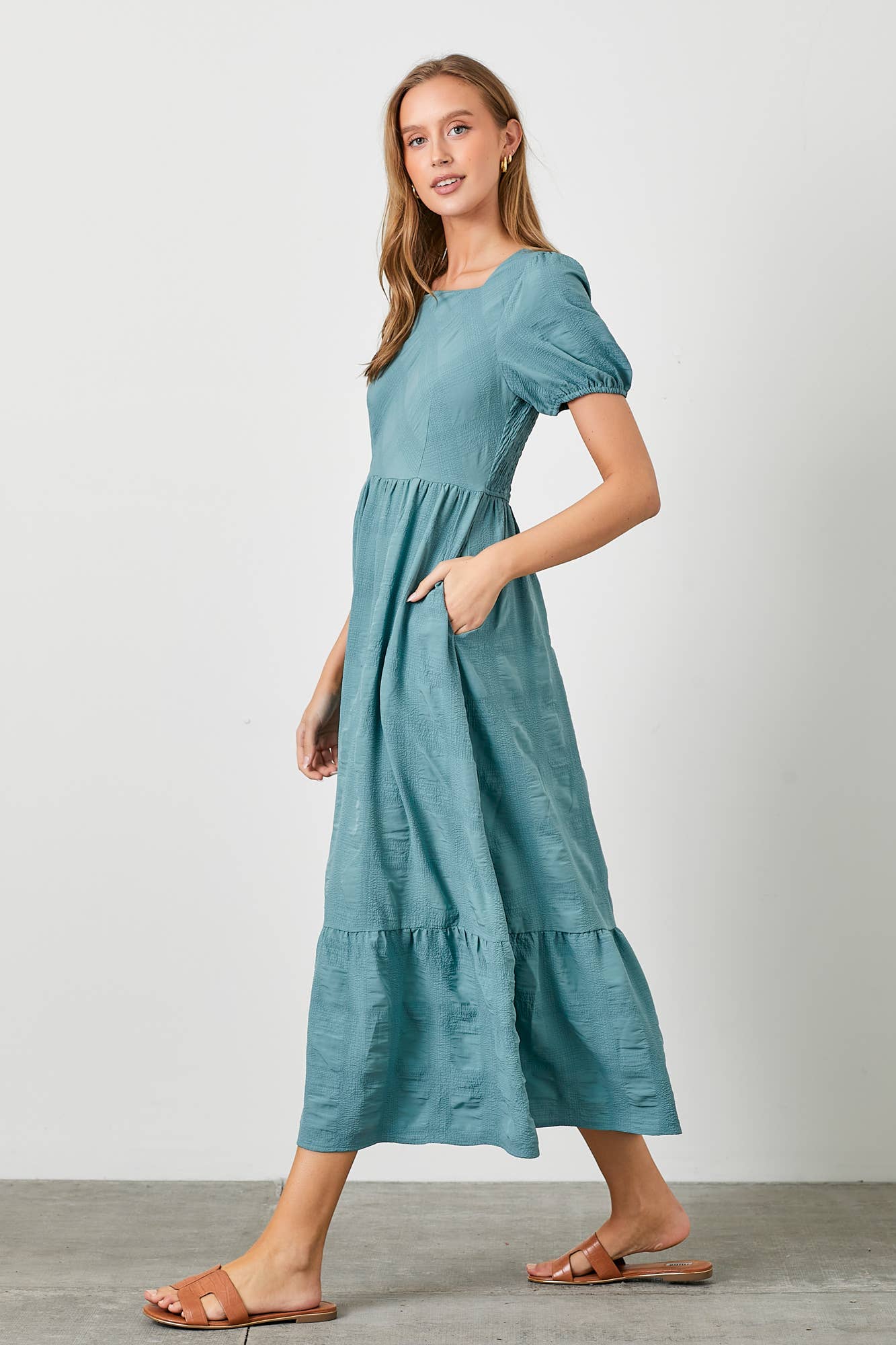 TEXTURED WOVEN SQUARE NECK MIDI DRESS: DUSTY TEAL / XL