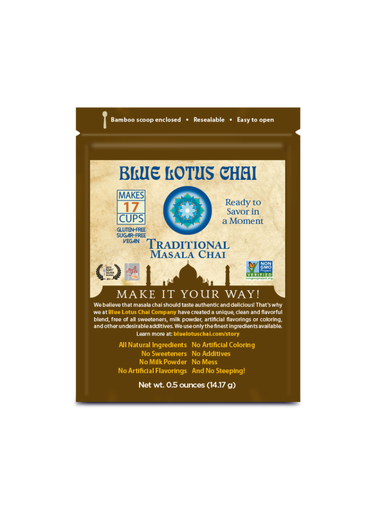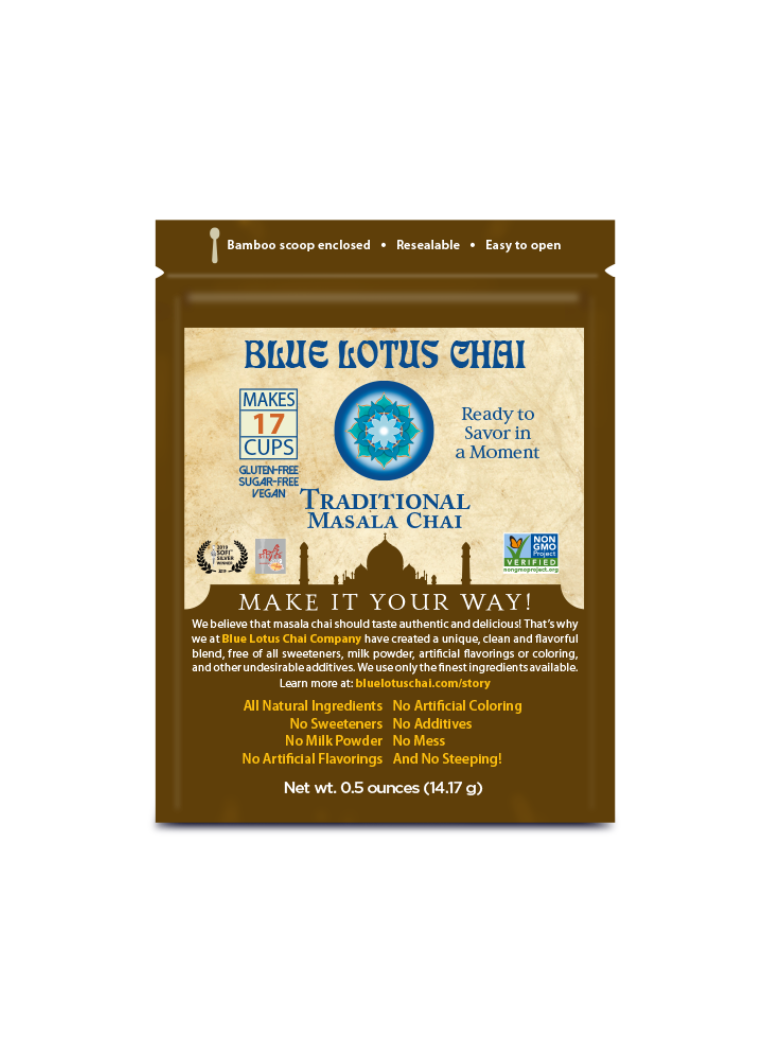 Our Traditional Masala Chai is our flagship product. Made with the finest brewed and flash-dried black tea from Northern India, and expertly blended with our six signature organic spices. With its deep and truly authentic flavor and amazing ease of preparation, this delicious blend has become part of the daily rhythm of many homes. Tasting is believing! Our display box of ten pouches is a great option on the shelf of any retail shop or grocery department, and is a popular gift or sampling option for customers. Each 1/2 oz pouch makes 17 cups of chai. Blue Lotus Chai is unsweetened with no milk powders, artificial ingredients, or preservatives. Non-GMO Certified, Gluten Free, and Vegan. No major allergens are present in this product. No major allergens are processed or stored at our facility.