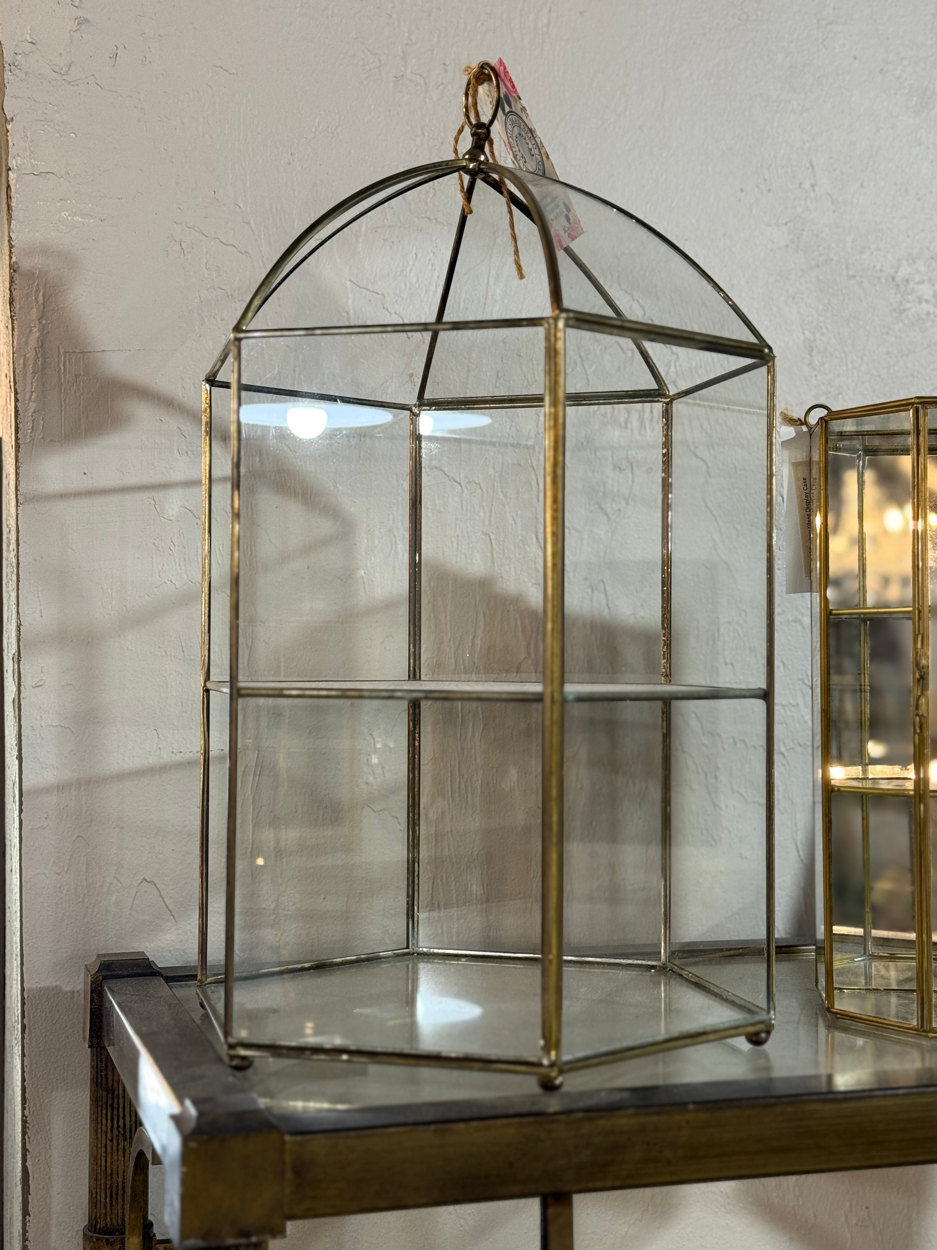 Glass & Brass Curio Cabinet. Glass all around with one side open. Ring on the top for hanging. 18” tall, 11” wide